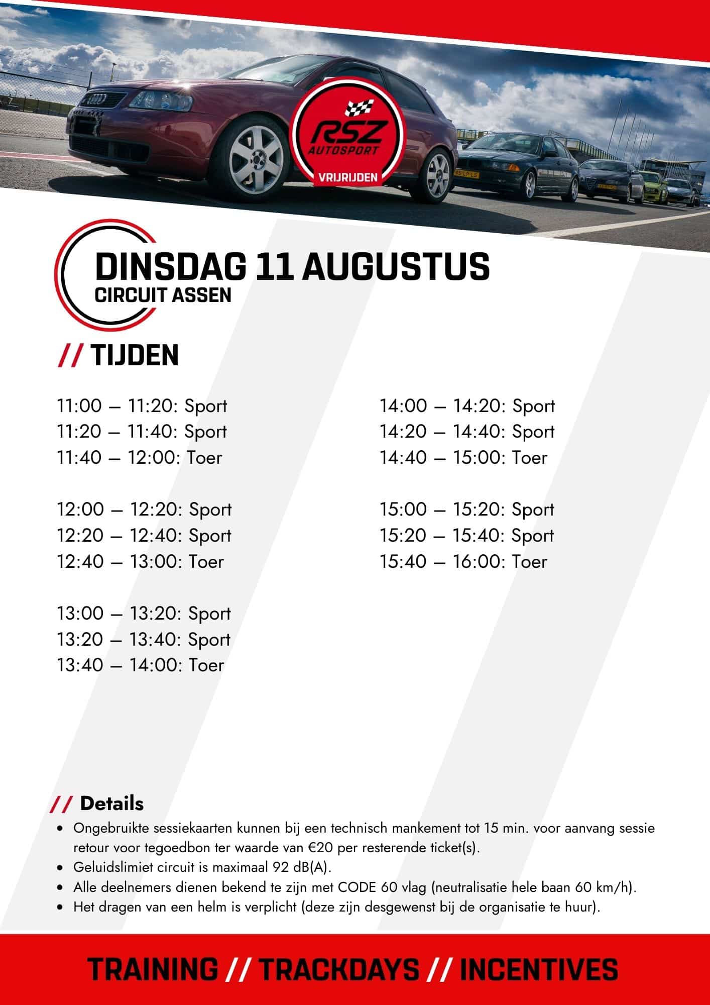 Geschikt voor zowel circuitverkenners als rijders met enige trackday-ervaring. Kom je voor het eerst het circuit op, dan adviseren we begeleiding van een RSZ-instructeur.
